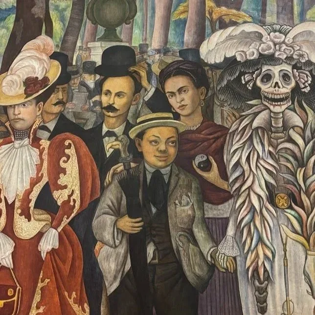 After leaving this location, we walked along Alameda Central to the Museo Mural Diego Rivera. This museum was smaller scale, but there is an insane mural by Rivera himself on the ground floor that features Alameda Central with over 100 identifiable figures, and spans 400 years of Mexican History. The mural is nearly 16 ft tall and 50 ft wide, it's truly jaw dropping. I stayed there for a significant amount of time, going back and forth trying to identify each of the figures, and understand their significance in history. At the center of the painting, Rivera features himself as a child, holding hands with Death who is depicted as a beautiful woman. Behind him is Frida Kahlo, his wife looking iconic as ever. Knowing that we'd be going to CoyoacΓ‘n the next day and see the museum dedicated to her made this even more engaging for us. The museum ties some of the figures in the painting into other artist's works, and there were some more contemporary works upstairs as well. There was even a rare photo of Kahlo and Rivera on the wall.